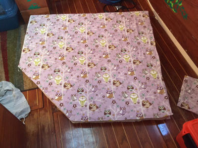 From there, the mattress cover. Kinsley picked out the owl upholstery fabric and I set to work. I wrapped the longest edge with the fold rather than creating a seamed edge. It let me save more fabric for the other edges as well as saving my sanity. I added a 48″ zipper along the second long edge that ran the whole size as well as around the corner and onto a second side. I added less than half an inch of seam allowance for the top and bottom panel. I knew I was cutting the dimensions of the cover very close, siding towards barely big enough rather than too big. Surprisingly, geometry was on my side and I managed all the seams and turning right on the first try. It took both Alex and I to jam the mattress into the cover but it fits her space perfectly.