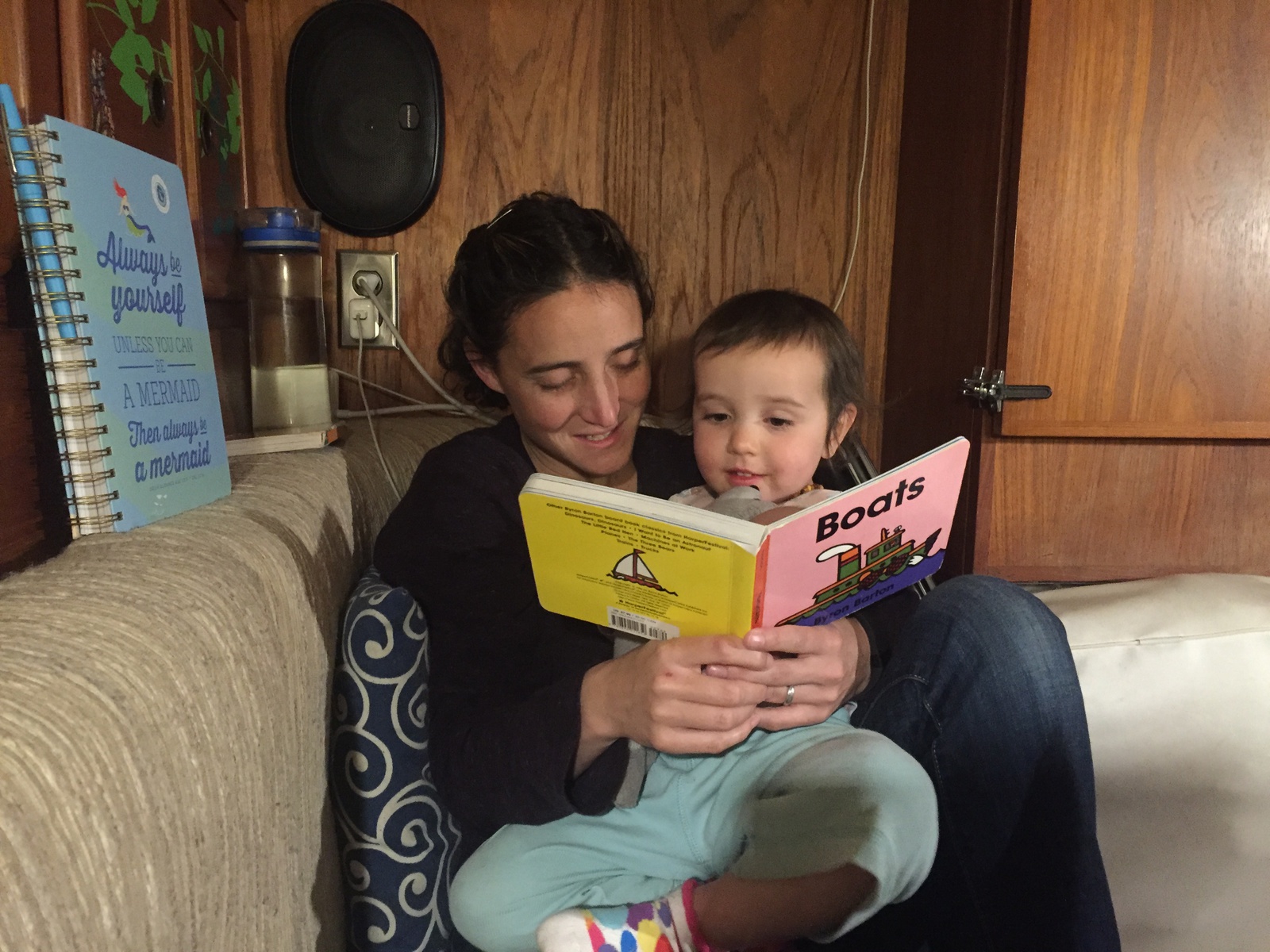 Her books make their home all over the boat. Library books usually pile up next to my bed where we read before bed each night. Others are stored in a box under her bed or on the little shelf in her room. I also keep a bag of books in the car and rotate these from the car to the boat from time to time. Come spring, when our storage unit is a little easier to dig through, I’ll freshen up her library with some old favorites from there as well.