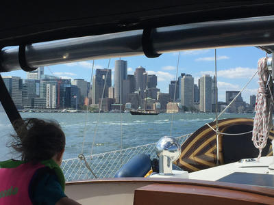 Pulling out of Gloucester we could see Boston’s skyline on the horizon. Distances are deceiving, just because we could see Boston didn’t mean we would be there quickly. About five hours lay between us and home. The day’s trip had a similar sensation to the end of a long car trip. We started seeing landmarks we knew well, places we’ve been before. Zoe pointed out Spectacle Island, one of her favorites. Kinsley kept lookout for bouys and ferries, and we put away the charts and switched to navigating by familiar sights and bouys.