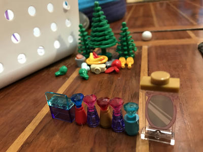 Small pieces, for Kinsley, are placeholders in her stories. She overflows with ideas and they pour out at playtime. Her toys argue, act stubborn, get into mischief, and sort themselves out again. They throw parties, adopt kittens, and grocery shop. I’ve watched her create a vet’s office, celebrate weddings, teach school, and explore islands with nothing more than a collection of pipe cleaners and tiny wooden blocks.